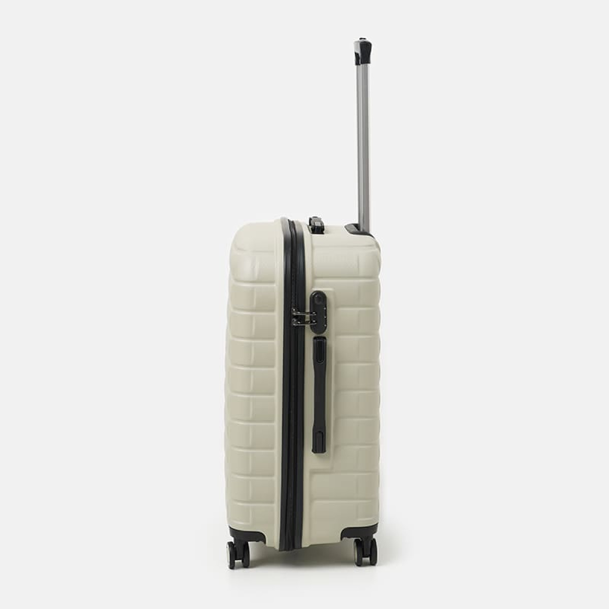 Чемодан оснащён четырьмя сдвоенными колёсами с вращением на 360°, выдвижной телескопической алюминиевой ручкой с тремя уровнями фиксации и кодовым замком.